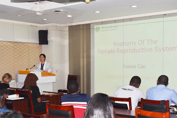 曹云霞结合多媒体课件,用流利的英语为2015级MBBS专业国际学生讲授了《妇产科学》课程的第一节内容。她讲授过程生动清晰、重点突出,课件图文并茂,得到国际学生的一致好评。课后,曹云霞还询问了国际教育学院的教学巡查情况,并对第一天的教学秩序给予肯定。她指出,国际教育要向“提质增效”转型,希望该学院继续加强国际学生的教学管理。