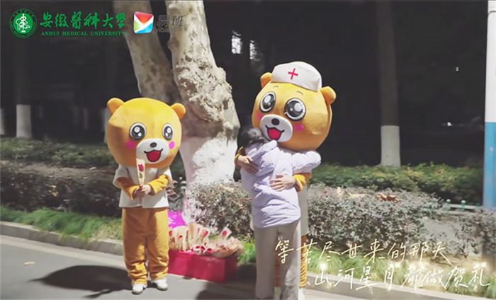 每至考研季,安医学子总能与易班小熊的拥抱不期而遇——学校易班发展中心的学弟学妹们穿上可爱的玩偶熊出现在图书馆和自习室门口,给过往学习结束之后的考生大大的拥抱并送上一朵玫瑰。同时也为大家准备了考研祝福墙,学弟学妹们可以为学长学姐们送上美好的祝愿,以此缓解他们备考过程的疲劳和忧虑。