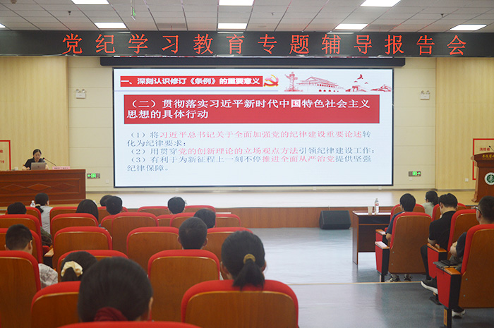 65日下午,校纪委书记、省监委驻校监察专员黄新美为东校区教职工党员作党纪学习教育专题辅导报告。