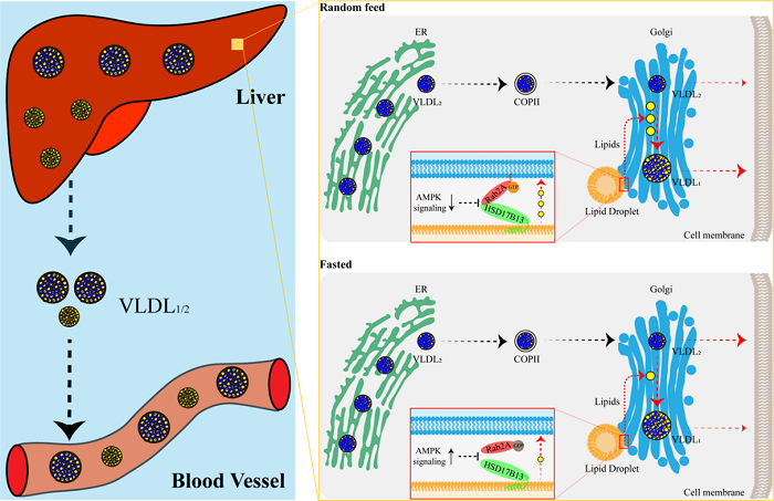脂滴是细胞内普遍存在,主要由甘油三酯和胆固醇酯组成,具有能量储存和介导细胞器之间信号转导等多种功能的细胞器。陈亮课题组的研究结果首次表明,脂滴-高尔基体之间的细胞器互作参与调控VLDL的脂化成熟和分泌。相关实验结果还表明,AMP激活的蛋白激酶(AMP-activated protein kinase, AMPK)可以抑制Rab2A蛋白的活性,从而调控脂滴-高尔基体之间的细胞器互作,最后降低VLDL的脂化成熟。研究结果为理解肝脏和血液的脂质代谢稳态提供了新的视角,对动脉粥样硬化性心血管疾病的预防和治疗提供了新的理论依据。