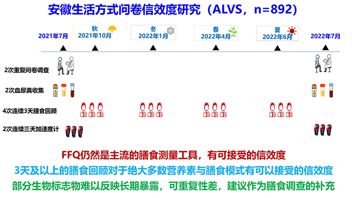 拥有一份能准确可靠的收集长期饮食习惯的调查问卷是人群营养研究成功的关键。为了服务安徽肝病研究(ALDS)自然人群队列与安徽肝癌胃癌与大肠癌研究(ALGCS)专病队列现场膳食调查工作,营养与肿瘤科研创新团队立足安徽省三山夹两平原的地理格局,以及“皖南-皖中-皖北”的饮食文化区划,研发了一套包含141项食物或食物组的食物频度问卷(FFQ),基本涵盖了安徽各地区常见食物与特色食物。团队开展了1年期的安徽生活方式信效度研究(ALDS),以检查问卷能否有效的收集队列人群的饮食等行为生活方式。系列结果提示,该问卷能较为可靠地评估绝大部分膳食模式、食物及营养素,其中两种主要多酚(大豆异黄酮与木酚素)的信效度研究发表在《美国临床营养学杂志》。